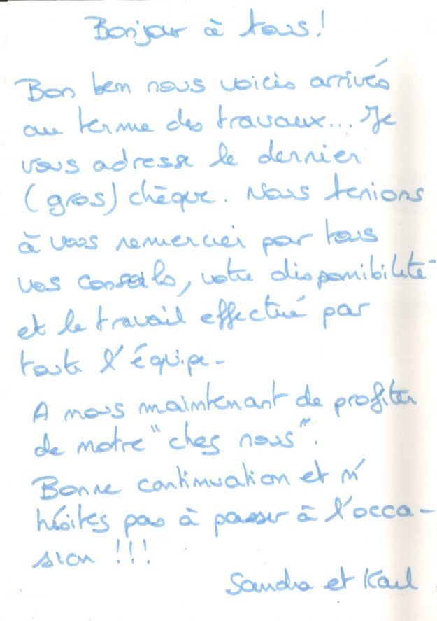 “ Nous voici arrivés au terme des travaux… Nous tenions à vous remercier pour tous vos conseils, votre disponibilité et le travail effectué par toute l’équipe. à nous maintenant de profiter de notre « chez nous ». Un grand merci à tous. ”