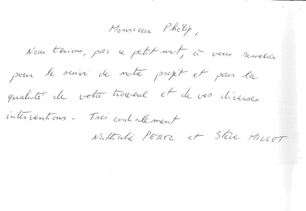 “Monsieur PHELIP, Nous tenions, par ce petit mot, à vous remercier pour le suivi de notre projet et pour la qualité de votre travail et de vos diverses interventions.”